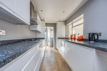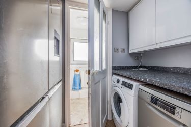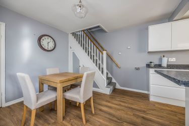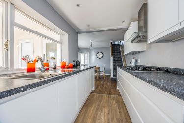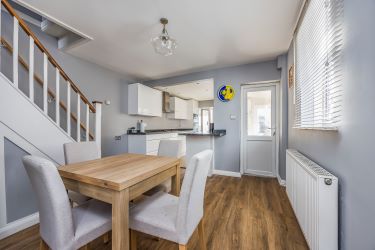 The property has been improved by the current owners and offers further potential for enhancement, making it an attractive opportunity for both owner-occupiers and property investors alike. Accommodation comprises a generous entrance lobby with French doors opening onto the south-facing rear garden, an open-plan kitchen/dining room fitted with modern white handleless units and built-in appliances, and a dual-aspect sitting room featuring a character fireplace. A ground floor cloakroom and utility area complete the ground floor. To the first floor are two well-proportioned bedrooms, with the principal bedroom benefiting from an ensuite wet-room style shower, alongside a separate WC.