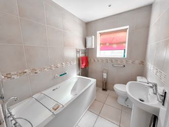 Step inside and you'll find a welcoming entrance hallway leading to a bright and airy sitting room, complete with a charming bay window overlooking the front garden. The master bedroom boasts its own en-suite shower room, while a second generous double bedroom offers direct access to the rear garden - perfect for morning coffee or summer evenings with the doors open. The property also provides a third bedroom, a large family bathroom, and a well-appointed kitchen with abundant worktop space, excellent storage, and a fitted oven, with a back door opening to the side and rear gardens.